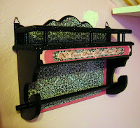 I started off by painting it black. I thought I would put this little shelf in my studio for some much needed storage and to hang a roll of paper towels on. After painting it black I was off to Hobby Lobby to figure out what scrapbooking paper I wanted to add to it. My studio is decorated in black and pink. After may trips back and forth from the scrapbook section to the fabric section and back I found two shades of pink and a beautiful black and white pattern paper. I printed the words "Craft From Your Heart" on one of the pink papers. So after much cutting and glueing and then glittering I was done. I hung it on the wall in my studio and put a roll of paper towels on the rod. Wouldn't you know it, this thing I guess wasn't meant for paper towels!!!! The roll won't, well roll.